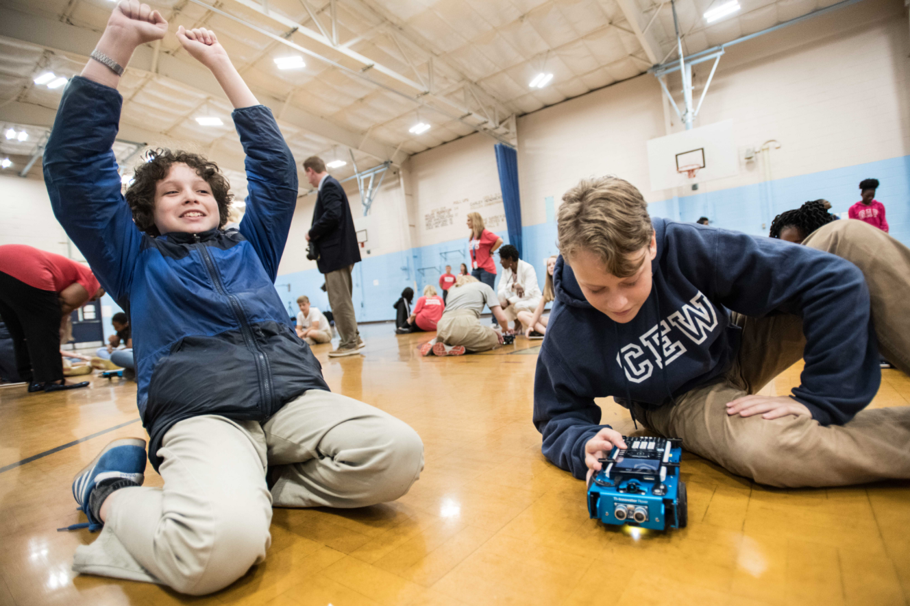 Students having fun seeing the practical application of math through robotics, with the TI-Innovator™ Rover.
