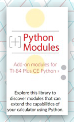 For some introduction and practice with some of the TI modules, see the additional [+] Python Modules section of TI Codes for TI-84 Plus CE Python.
