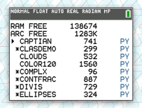 On the TI-84 Plus CE Python edition, all our .py files are stored as AppVars and have a special PY designation next to them when viewing them using [mem] > Memory Mgmt > AppVars. Some of my files seen here are in RAM and others are in Archive (*) to save memory. Only the files in RAM are available to use in the Python App. There may also be AppVars that are not PY files (even some that Python uses).