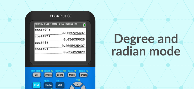 Bonus tip: You can be in either mode and still calculate in degrees or radians. For example, if I’m in radian mode but want to calculate the cosine of 49 degrees, I don’t have to switch modes! This is helpful when most of your calculations are in one mode but you have a few in another.
